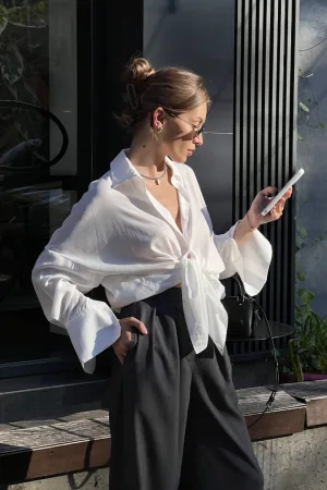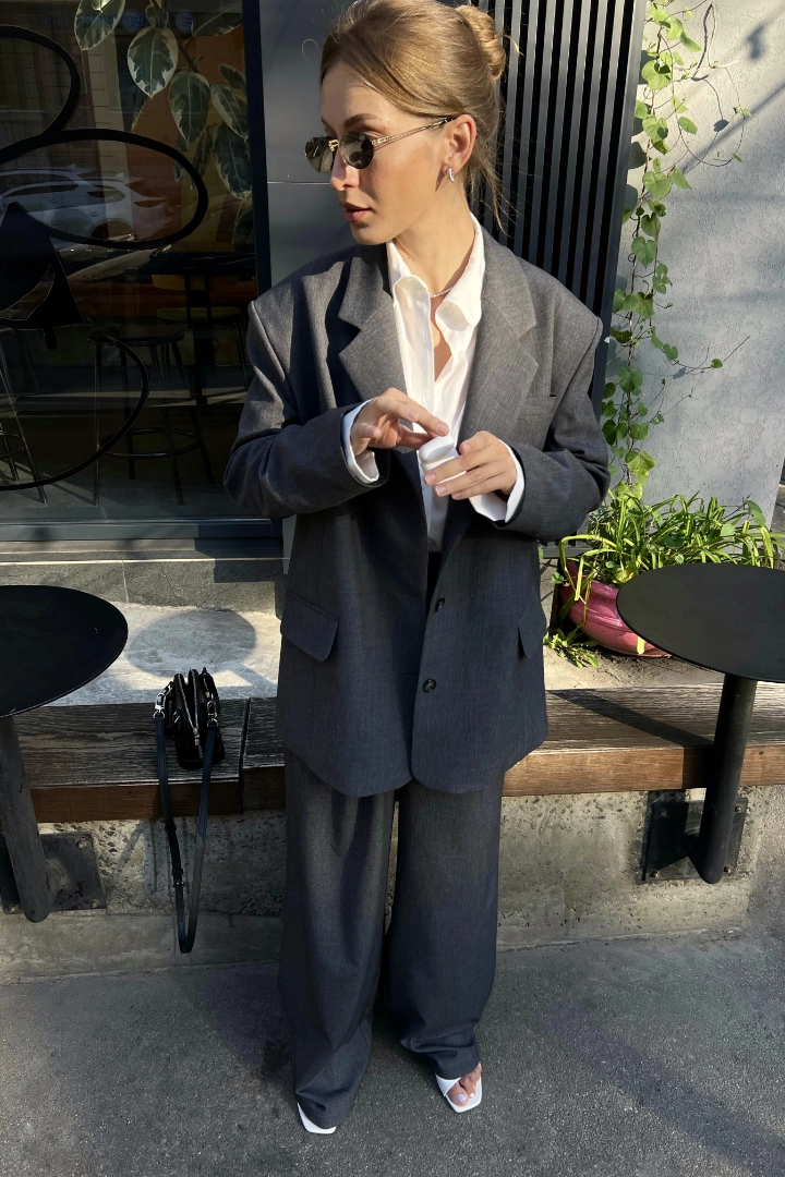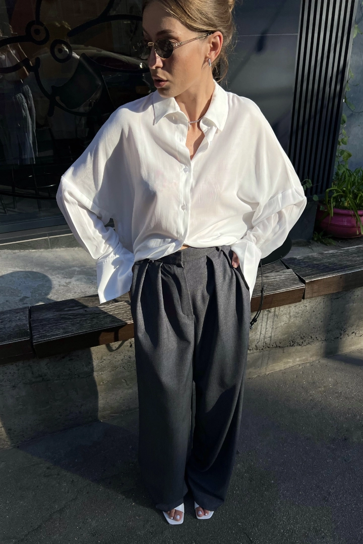 Брюки створюють елегантний та вільний силует, графітовий відтінок додає універсальності та легко поєднується з різними кольорами та аксесуарами. Висока посадка акцентує увагу на талії, візуально подовжуючи ноги та надаючи образу вишуканої легкості. Брюки виготовлені з приємної на дотик тканини, що забезпечує комфорт протягом усього дня. Фасон палаццо ідеально підходить для створення як офіційних, так і повсякденних образів. Брюки оснащені прихованою застібкою спереду і мають практичні бічні кишені.
